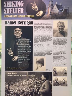 During Berrigan Week, I was fortunate to be able to attend the reflection talk by Bill Wylie-Kellerman as well as the film screening of ‘Seeking Shelter’ and the art exhibit that followed the event. As someone who had never heard of Daniel Berrigan before Tuesday, I found this week to be quite moving and inspirational as the actions of Daniel Berrigan are incredibly commendable and he is a true model for what Catholic, and Christian as a whole, activism should look like. Despite dislike by some, perhaps most, in the Catholic hierarchy, Berrigan, alongside his brother, Philip Berrigan, and William Stringfellow, persisted in his anti-war activism and never faltered in proclaiming his message of nonviolence. His influence covered all of America, from tiny Block Island to the breadth of New York City to the convicted felons imprisoned with him. I was also elated to read on one of the posters at the art exhibit that Berrigan ministered to AIDS patients in the 1980s when the AIDS epidemic was predominately affecting the gay community, so little to no action was being taken by the government and there was obvious and incredible discrimination. When no one was standing up to combat the horrific epidemic, neither the government nor the church nor did social services, Daniel Berrigan jumped in to ease the suffering as he could.